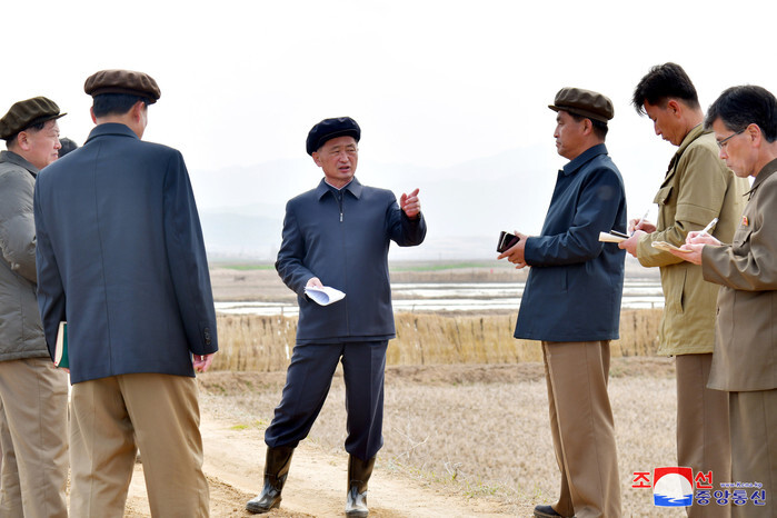 North Korean Premier Kim Tok-hun (3rd from L) inspects a farm in South Hwanghae Province, in this undated photo released by the North's official Korean Central News Agency on April 18, 2024. (For Use Only in the Republic of Korea. No Redistribution) (Yonhap)