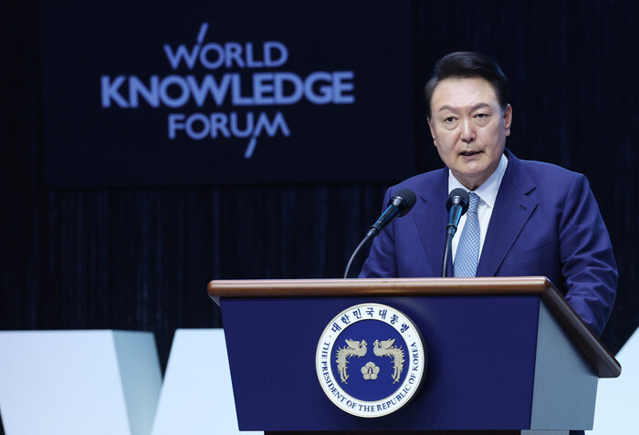 President Yoon Suk Yeol delivers a congratulatory speech at World Knowledge Forum in Incheon, 27 kilometers west of Seoul, on Sept. 10, 2024. (Yonhap)