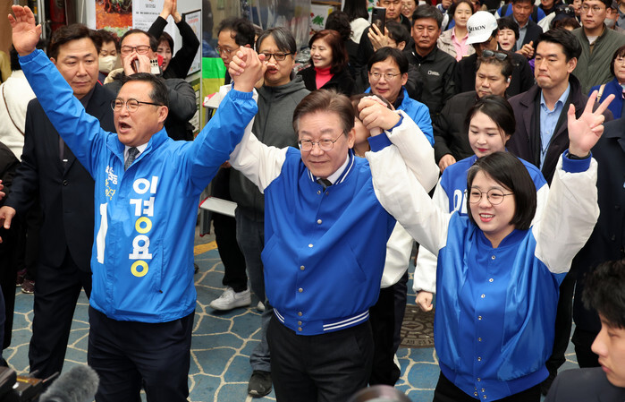 Lee Jae-myung (C), leader of the main opposition Democratic Party (DP), raises his arms alongside Lee Kyong-yong (L) during a visit to a traditional market in Jecheon, 115 kilometers southeast of Seoul, on March 22, 2024, to seek voter support for the DP candidate in the city for the April 10 general elections. (Pool photo) (Yonhap)