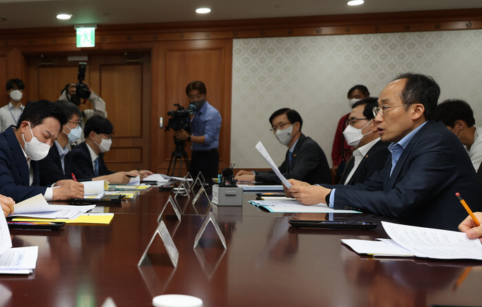 Finance Minister Choo Kyung-ho (R) presides over an emergency meeting with ministers in charge of economic affairs at the government complex building in Seoul on June 19, 2022, as the government unveiled a set of measures to curb high inflation, including additional tax cuts. (Yonhap)