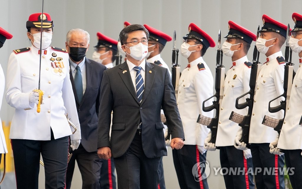 ▲ South Korean Defense Minister Suh Wook inspects honor guards at the headquarters of Singapore's defense ministry in Singapore on Dec. 23, 2021, in this photo released by the Ministry of National Defense. (PHOTO NOT FOR SALE) (Yonhap) |