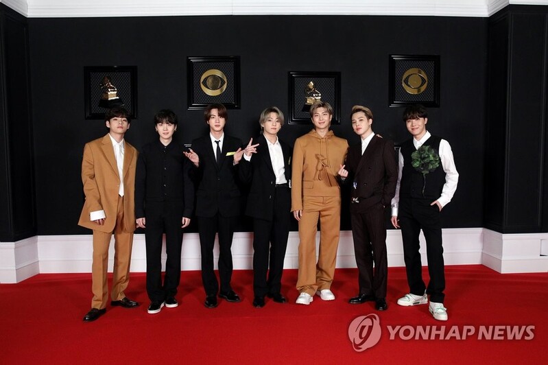 | ▲ This photo, provided by Big Hit Entertainment, shows K-pop megastar BTS hitting the red carpet online as it takes part in the 63rd Grammy Awards. (PHOTO NOT FOR SALE) (Yonhap) |