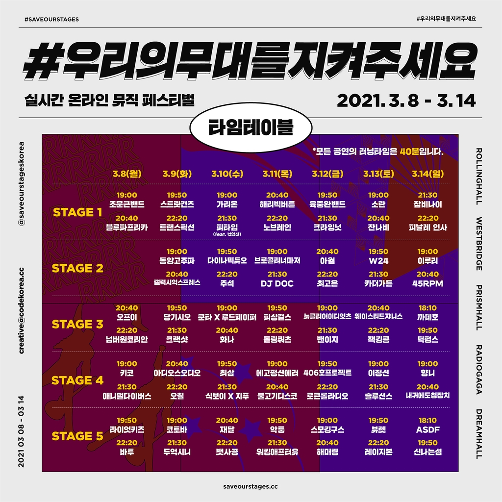 | ▲ 온라인 페스티벌 '#우리의무대를지켜주세요' 타임테이블 [코드 제공. 재판매 및 DB 금지] |