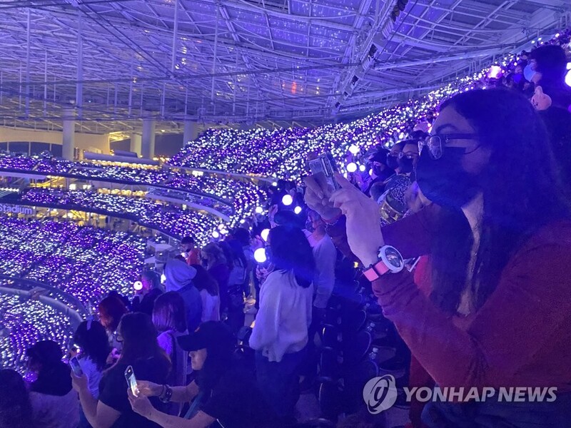 ▲ Fans of South Korean supergroup BTS enjoy BTS' in-person concert, titled "BTS Permission To Dance On Stage - LA," at SoFi Stadium in Los Angeles on Nov. 27, 2021. (Yonhap)