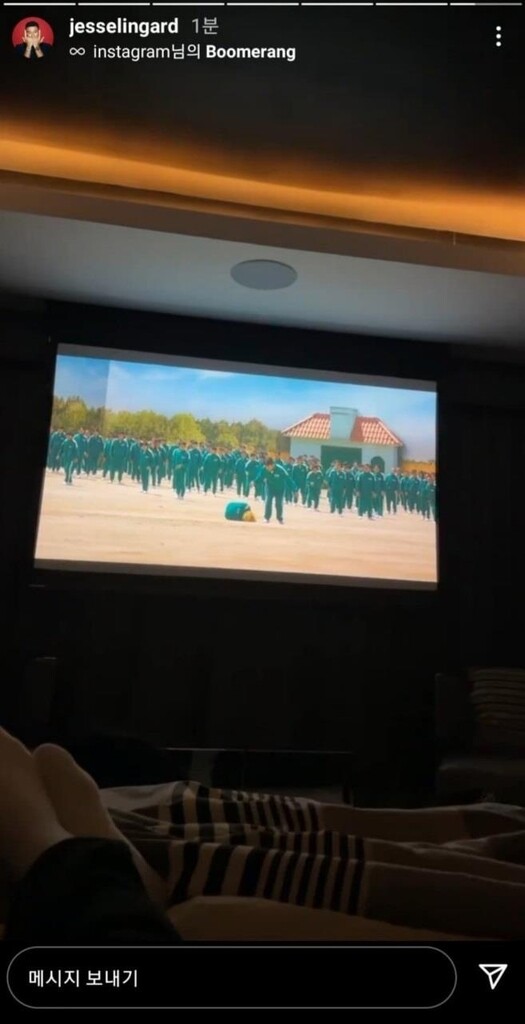 Jessie Lingard, 75,000 pound (about 120.4 million won) of weekly payment worth Manchester United’s star player, has uploaded consecutive photos of him watching “Squid Game” in his bed on his Instagram page. The scene on his page was from the first game “red light green light.”