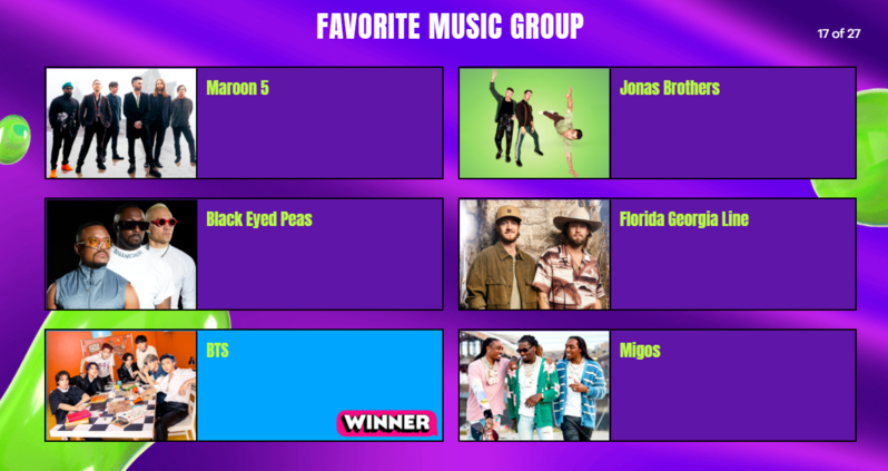 | ▲ This photo, a captured image from the official Nickelodeon website, shows BTS winning the "Favorite Music Group" award at the "2022 Kids' Choice Awards." (PHOTO NOT FOR SALE) (Yonhap) |