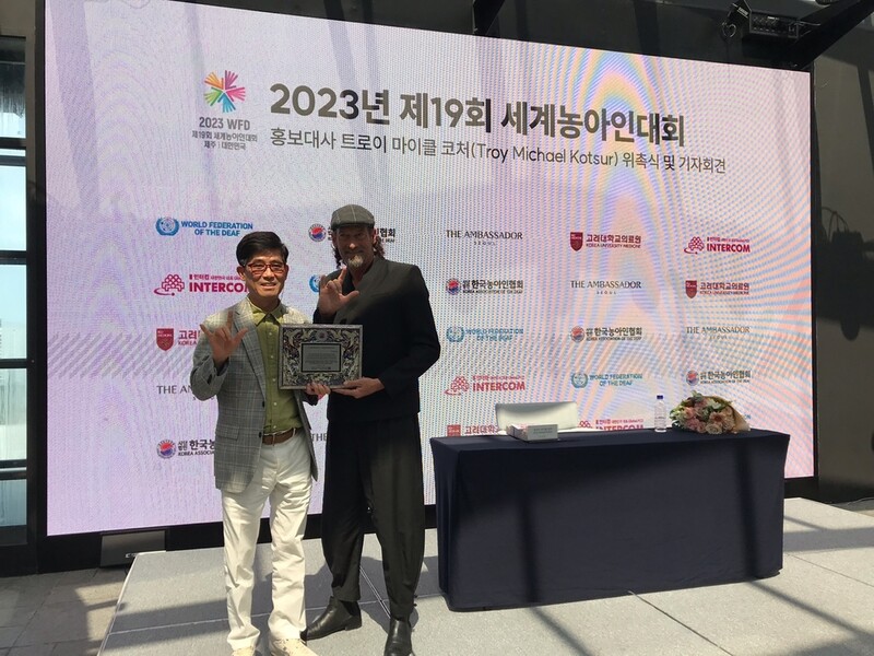| ▲This photo shows, actor Troy Michael Kotsur and the president of Korea association of the deaf at the appointing ceremony. (Yonhap) |