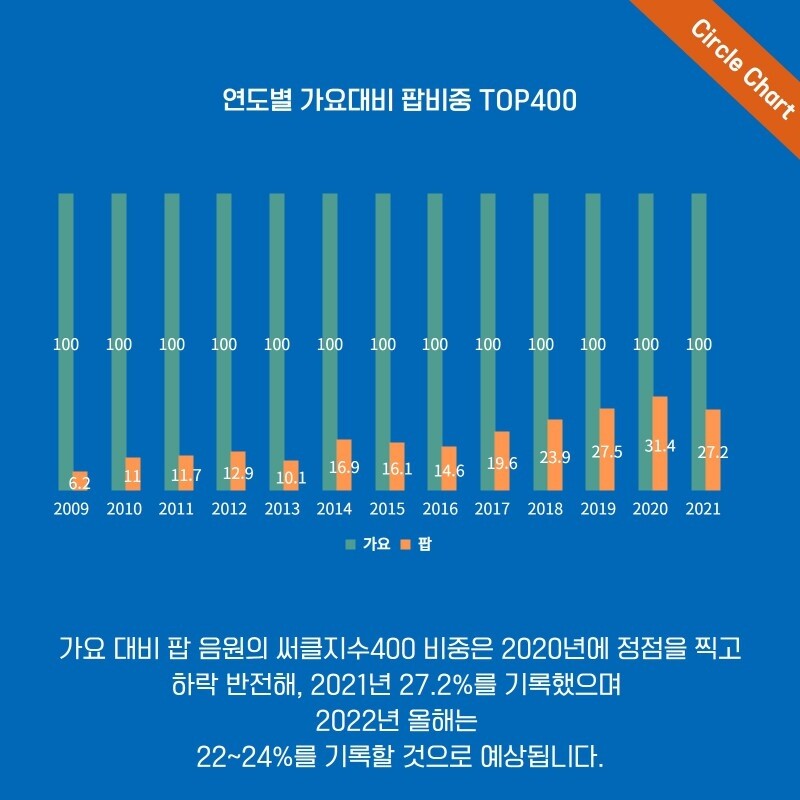 According to the lead researcher Kim Jin-woo of the Circle Chart on Tuesday, starting from January until September of 2022 pop consumption has been accounted 22 percent per month, at this rate consumption rate of pop music will be able to hit lowest point, even lower than its record in 2017, 19.6 percent.