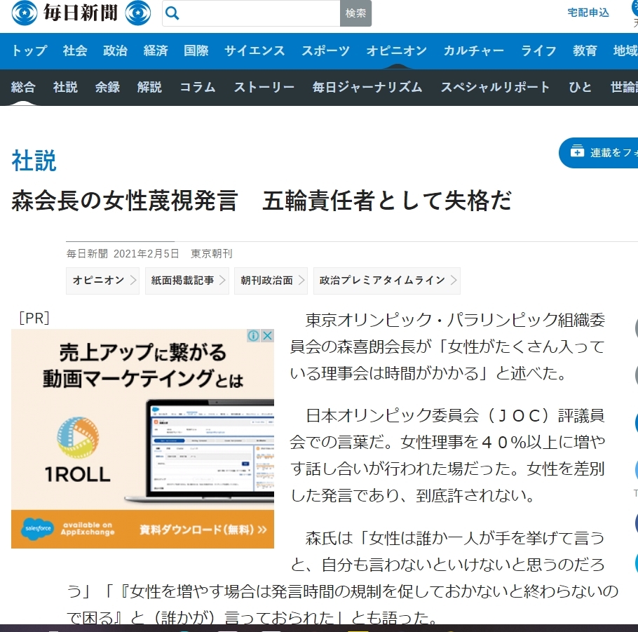 | ▲ (도쿄=연합뉴스) 여성 차별 발언을 한 모리 요시로 2020도쿄올림픽·패럴림픽 조직위원장의 사퇴를 주장하는 마이니치신문 5일 자 사설. [마이니치신문 해당 웹페이지 갈무리] |