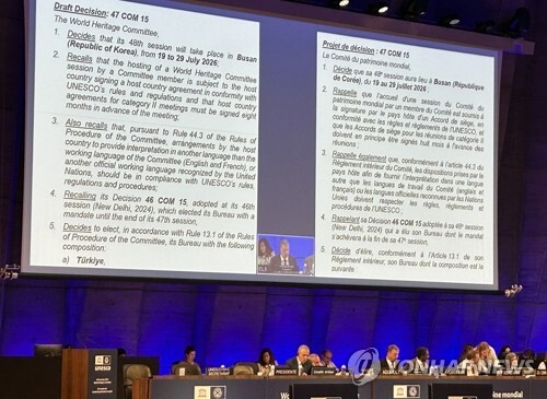| ▲ The 47th session of the UNESCO World Heritage Committee is held at UNESCO headquarters in Paris on July 15, 2025 (local time). During the session, South Korea was confirmed as the host country for the next meeting, with the 48th session scheduled to take place in Busan from July 19 to 29, 2026. (Yonhap) |