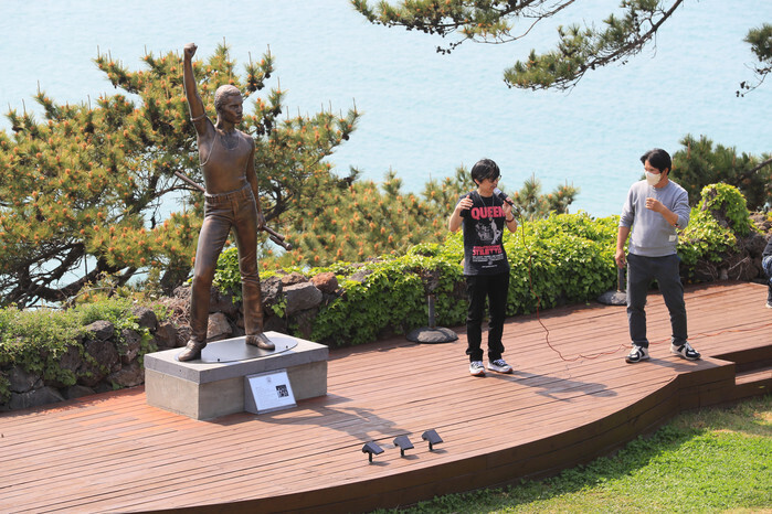 These photos, taken by Park Ji-ho, a photo reporter at Yonhap News Agency's Jeju News Headquarters, show the members of S. Korean fan clubs of the legendary British rock band Queen, who took part in a ceremony to unveil a statue of the band's lead singer Freddie Mercury at a beach in the city of Jeju on South Korea's largest island of the same name on Apr. 21, 2022.