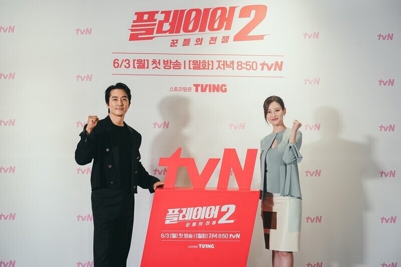| ▲ This photo, provided by TV broadcasting channel tvN, shows South Korean actors Song Seung-heon (L) and Oh Yeon-seo posing for photos at the media conference for his upcoming TV series "Player 2" held in Seoul on May 28, 2024. (PHOTO NOT FOR SALE) (Yonhap) |