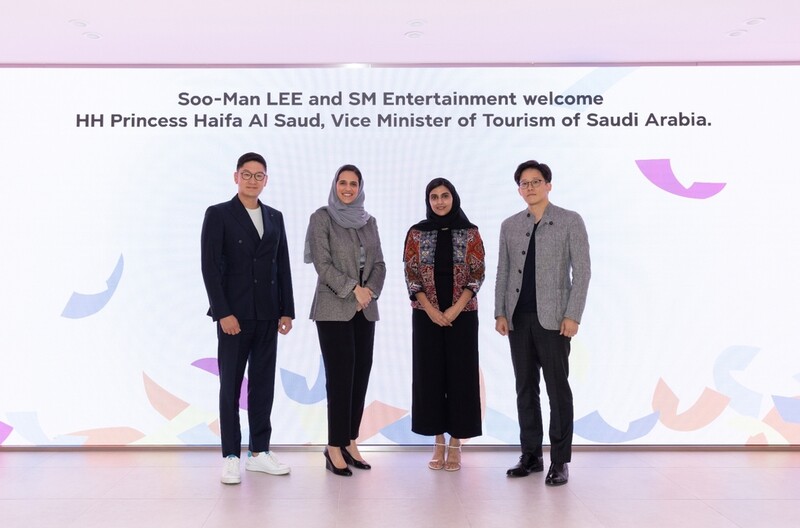 SEOUL, September 23 (Yonhap) -- SM Entertainment announced that the co-representatives of SM Entertainment, Lee Sung-soo and Tak Young-joon, met Haifa Bint Mohammed Al Saud, the princess and Vice Minister of Tourism, on September 21 at the new SM building located in Seongsu, Seoul, to talk about their collaboration.