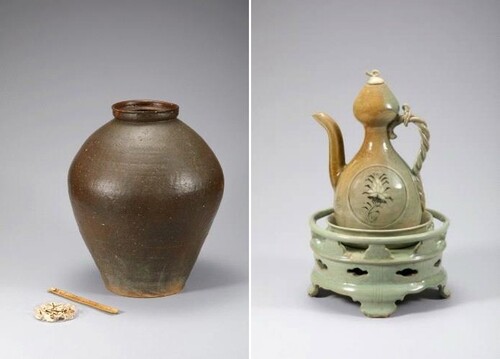 | ▲ These photos provided by the National Research Institute of Maritime Cultural Heritage shows the earthenware jar, bamboo slips and crustaceans recovered from the Mado No. 1 shipwreck (L) and a celadon ewer in the shape of a gourd with peony and lotus designs, along with a dish and stand. (PHOTO NOT FOR SALE) (Yonhap) |