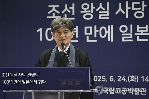 | ▲ Takao Sato, head priest of Japan’s Kotoku-in temple and owner of the Joseon royal shrine building "Gwanwoldang," delivers remarks during a news conference, "Joseon Royal Shrine Gwanwoldang Returns to Korea After 100 Years," held at the National Palace Museum of Korea in Jongno District, Seoul, on June 24, 2025. (PHOTO NOT FOR SALE) (Yonhap) |