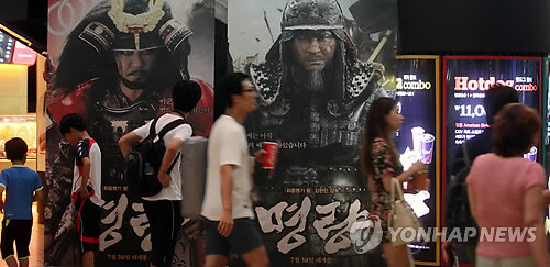 | ▲ This photo shows moviegoers in a movie theater in Seoul, on Aug. 10, 2014, looking at movie posters for "The Admiral: Roaring Currents." (Yonhap) |