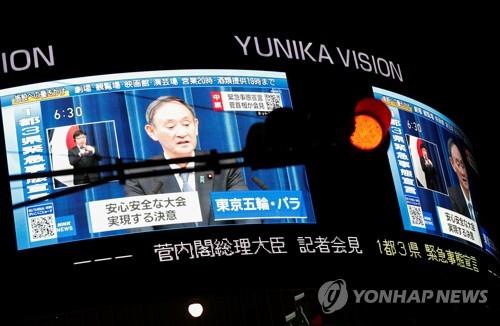| ▲ (도쿄 로이터=연합뉴스) 7일 일본 도쿄도(東京都)에 설치된 대형 스크린에 스가 요시히데(菅義偉) 일본 총리가 신종 코로나바이러스 감염증(코로나19) 긴급사태를 선언하는 기자회견을 하는 장면이 중계되고 있다. |