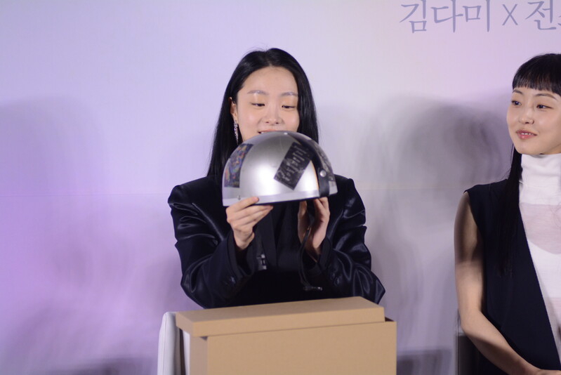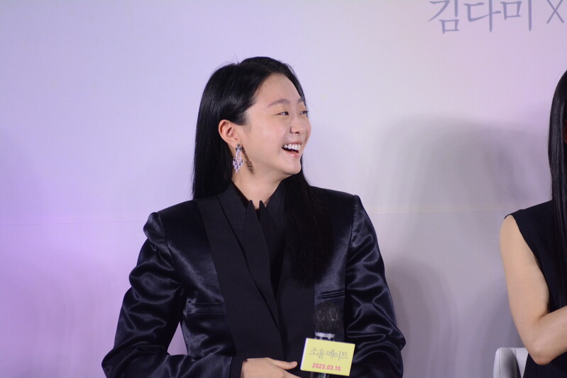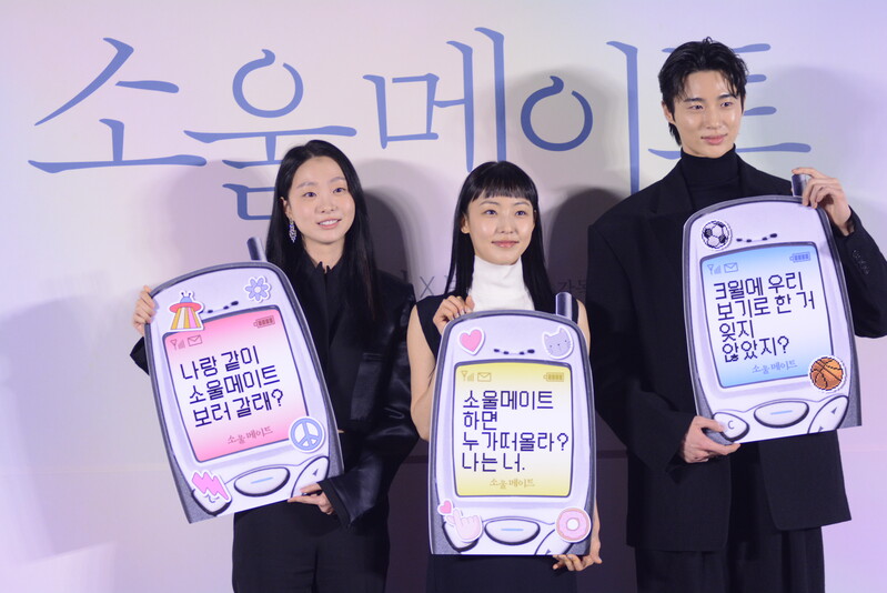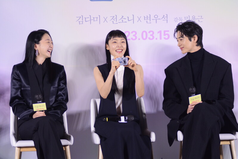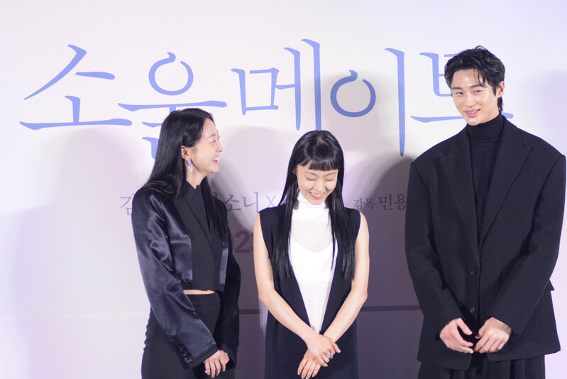 These photos, taken during the press conference of the upcoming S.Korean movie "Soul Mate" show actress Kim Da-mi, Jeon So-nee and actor Byeon Woo-seok posing for their individual and group photos and answering questions throughout the session.