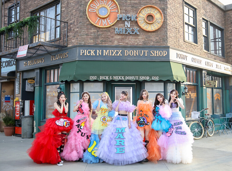 These photos, provided by JYP Entertainment, show the MV behind cuts of NMIXX’s debut song “O.O.”