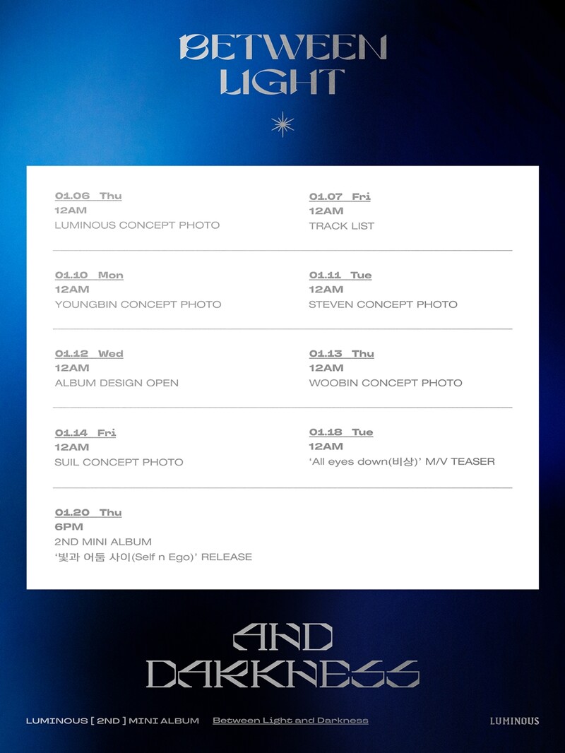 SEOUL, Jan. 5 (Yonhap) -- Boy group LUMINOUS will drop a new mini-album “Self n Ego” on Jan. 20, announced the Barunson Entertainment, Wednesday.