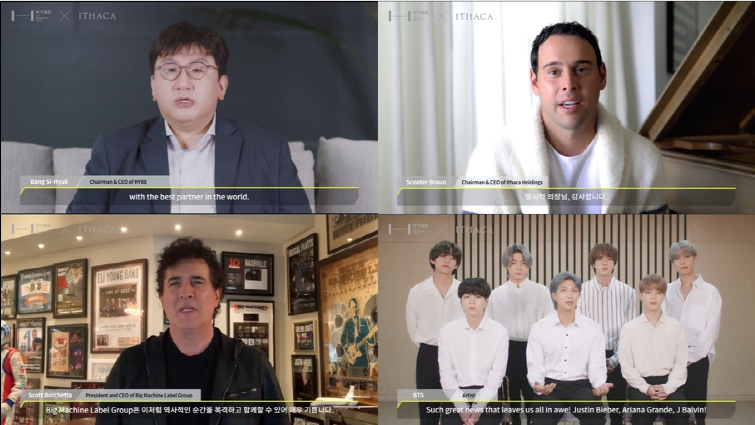 | ▲ This combined photo provided by HYBE Corporation shows both the HYBE and Ithaca Holdings executives and major artists delivering their congratulatory messages on the partnership. |