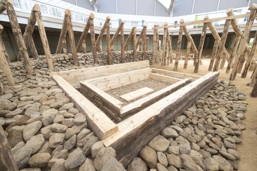 “After erecting the wooden framework, we are currently reproducing part of the double-layered burial chamber where the body and grave goods were placed, and stacking stones around it,” an institute official said, noting that the process is at the eighth stage out of a total of 21.