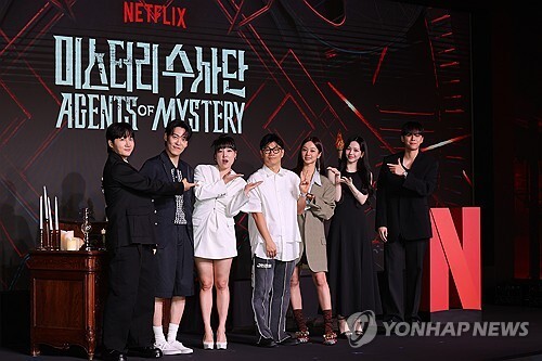| ▲ The lead cast and producer of Netflix' reality show "Agents of Mystery" pose for photos at the show's media conference held in Seoul on June 18, 2024. (Yonhap) |