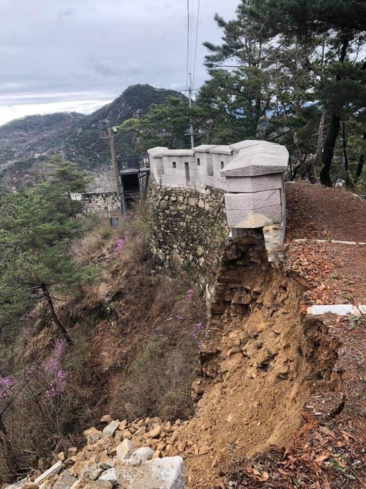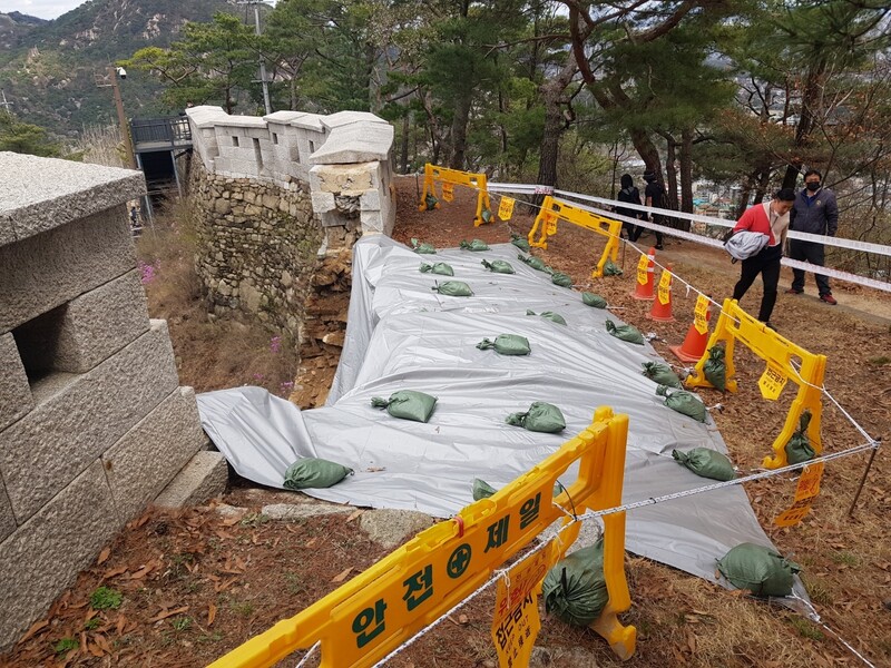 A section of Inwangsan Mountain in Seoul City Wall, which was built to protect Hanyang, the capital of the Joseon Dynasty, collapsed around 10 a.m. on April 4th. The collapse happened because the wall could not withstand the water pressure caused by the rain the previous day. Seoul City Wall is a cultural heritage that S. Korea wants to inscribe on the UNESCO World Heritage List.