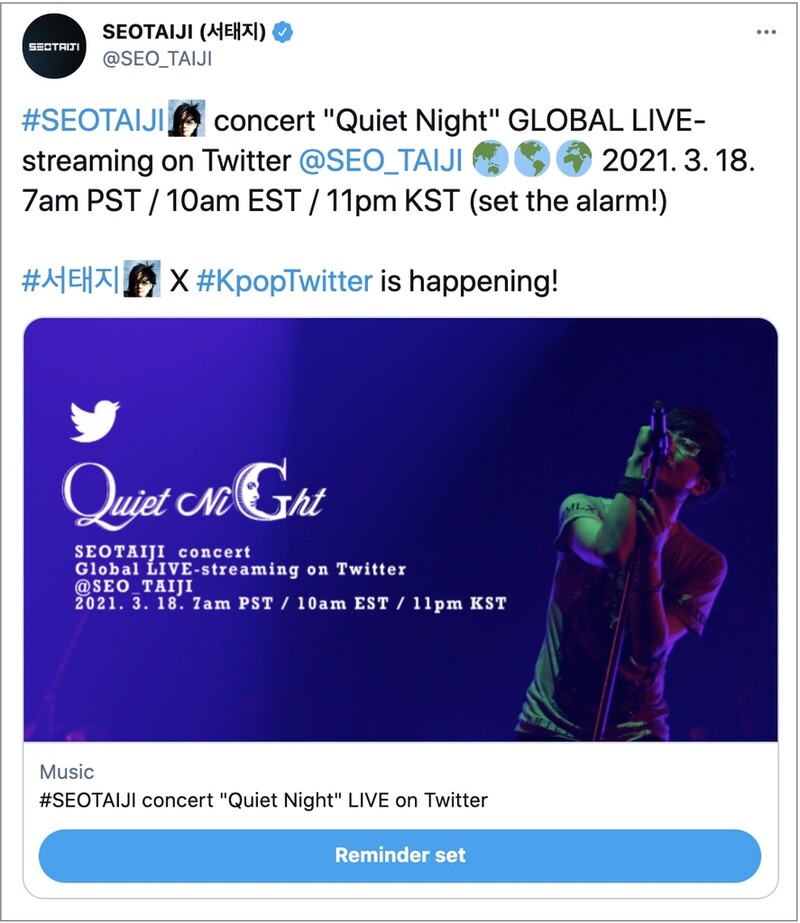 | ▲ This image provided by Twitter shows the details of singer Seo Tae-ji's live streaming concert. (PHOTO NOT FOR SALE) (Yonhap) |
