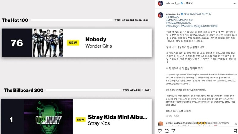 Park said, "So many things go through my mind," after posting a photo of Wonder Girls' performance of “Nobody” on the 2009 Billboard and Stray Kids' record side by side.