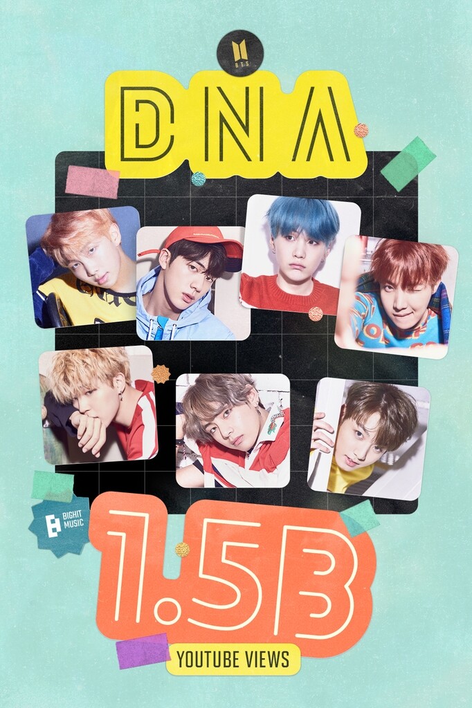 | ▲This photo, provided by Big Hit Music, shows that BTS' DNA has surpassed 1.5 billion YouTube views. (PHOTO NOT FOR SALE) (Yonhap) |