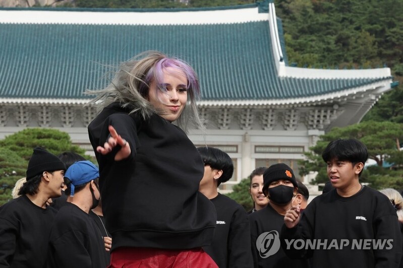 SEOUL, October 14 (Yonhap) --Crowds of foreigners dressed in black appeared in front of the Blue House's Grand Garden on the morning of October 14 and began dancing to K-pop.