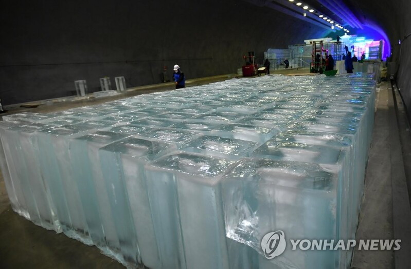 ▲This photo, provided by Hwacheon County Government show photo of workers working on the ice sculpture at the Indoor Ice Sculpture center plaza. (PHOTO NOT FOR SALE) (Yonhap)