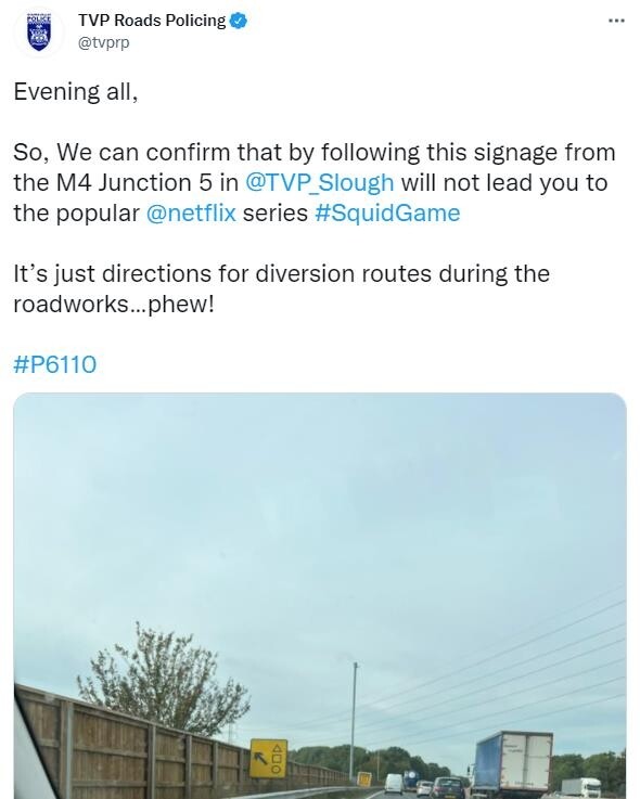 "We can confirm that by following this signage from the M4 Junction 5 in @TVP_Slough will not lead you to the popular @netflix series #Squid Game. It's just directions for diversion routes during the roadworks...phew!," the Thames Valley Road Police wittingly wrote on Twitter,