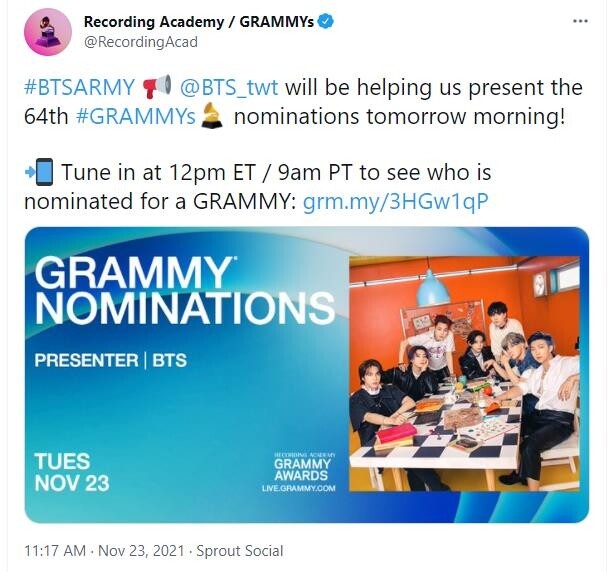 The U.S. Recording Academy, which hosts the annual Grammy Awards, announced Tuesday that "BTS will be helping us present the 64th Grammys nominations tomorrow morning!" on its official Twitter account.