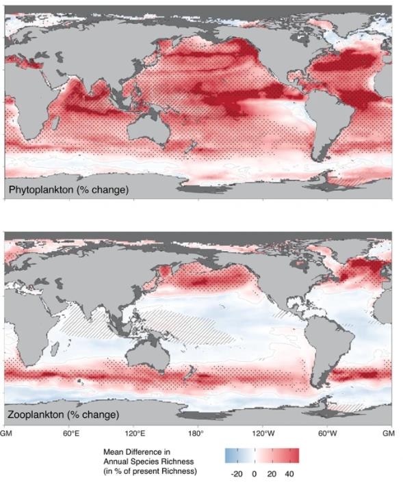 식물성 플랑크톤의 경우 북극해를 제외한 모든 바다에서 16% 이상 증가했다. 동물성 플랑크톤은 수온이 섭씨 25도를 넘는 열대와 아열대 바다에서는 줄어드는 대신 아한대 바다에서는 강하게 늘어나는 것으로 나타났다.