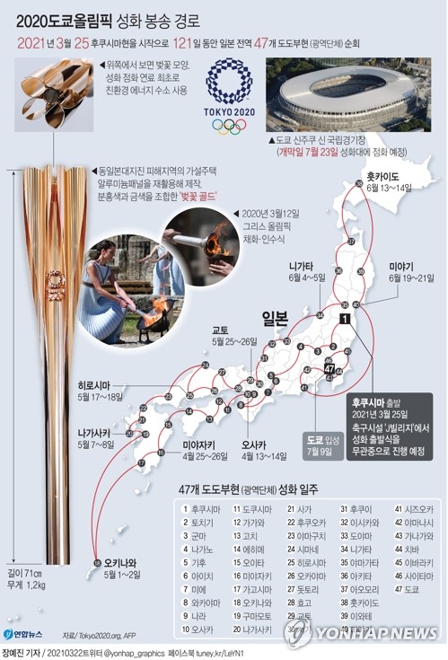 성화 봉송은 도쿄올림픽 개막식이 열리는 7월 23일까지 121일 동안 진행된다.