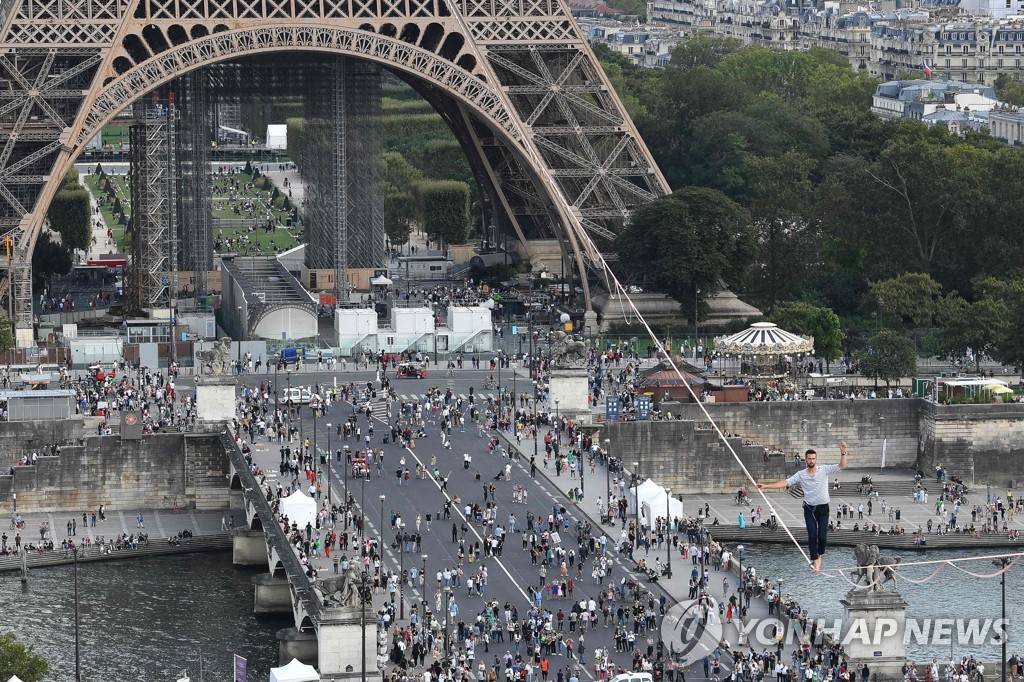 (런던=연합뉴스) 최윤정 특파원 = 프랑스 파리 에펠탑에서 70m 높이 외줄을 타고 센강을 건너는 곡예가 펼쳐졌다.