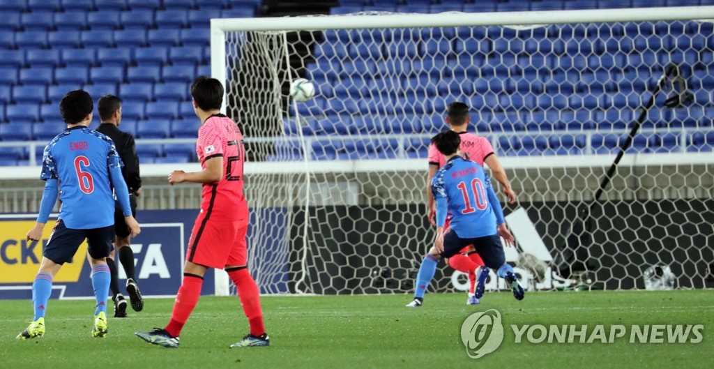 | ▲ 첫 골 실점 (도쿄=연합뉴스) 이세원 특파원 = 25일 일본 가나가와현 요코하마시 닛산스타디움에서 열린 80번째 한일전에서 한국팀이 첫 골을 실점하고 있다. 2021.3.25 srbaek@yna.co.kr |