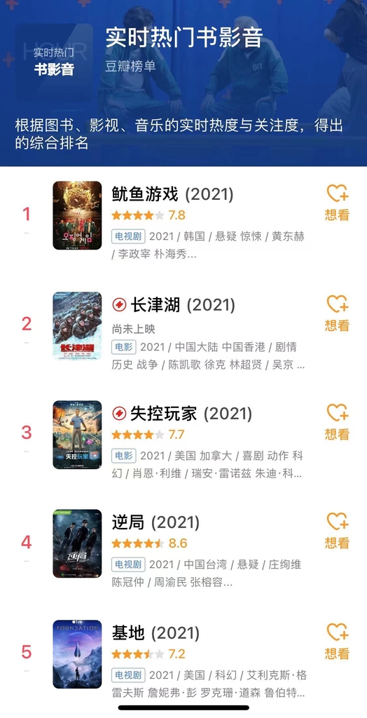 이날 평점 사이트 더우반(豆瓣)에서 '오징어 게임'은 실시간 영화·드라마 인기 순위 1위에 올랐다.