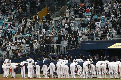 | ▲ '이겼습니다' (서울=연합뉴스) 신준희 기자 = 23일 고척스카이돔에서 열린 2020 프로야구 포스트시즌 한국시리즈(KS) 5차전 NC 다이노스와 두산 베어스의 경기가 NC의 5대0 승리로 끝났다. 경기를 마친 NC 선수들이 관중을 향해 인사하고 있다. 2020.11.23 hama@yna.co.kr |