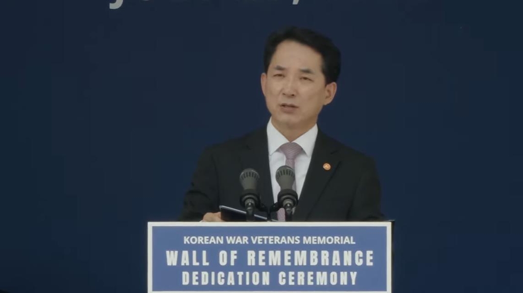 | ▲ South Korean Minister of Patriots and Veterans Affairs Park Min-shik delivers congratulatory remarks from President Yoon Suk-yeol in a ceremony dedicating the Wall of Remembrance, the newest addition to the Korean War Veterans Memorial, in Washington on July 27, 2022 in this image captured from the website of the Korean War Veterans Memorial Foundation. (Yonhap) |