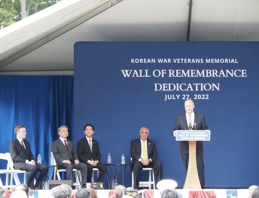 | ▲ Doug Emhoff (R), husband of U.S. Vice President Kamala Harris, delivers congratulatory remarks at the dedication ceremony for the Wall of Remembrance, a new monument added to the Korean War Veterans Memorial, in Washington on July 27, 2022. (Joint Press Corps-Yonhap) |