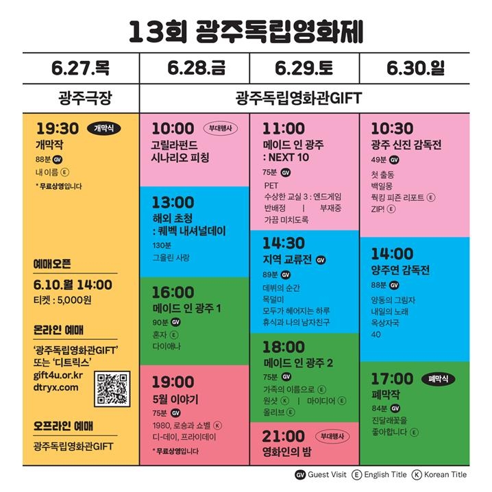 영화제 개막작과 5월 이야기 섹션 상영 영화는 무료로 관람할 수 있으며 상영 일정 등은 누리집(https://gjiff.modoo.at/)을 통해 확인할 수 있다.