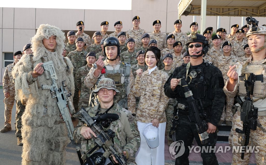 | ▲ First lady Kim Keon Hee poses with members of the Akh unit during a visit to their base in Abu Dhabi on Jan. 15, 2023. (Yonhap) |