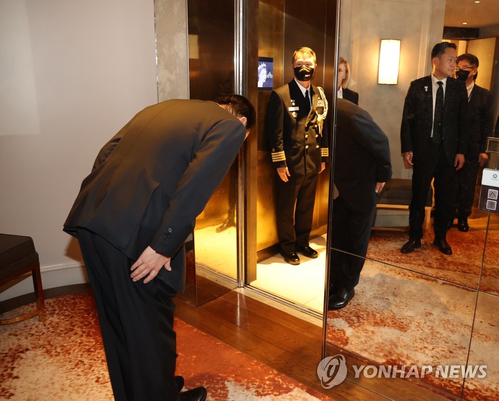 | ▲ President Yoon Suk-yeol bows deeply as he sees off Victor Swift, a British Korean War veteran whom he presented with the Civil Merit Medal at a hotel in London on Sept. 19, 2022. (Yonhap) |