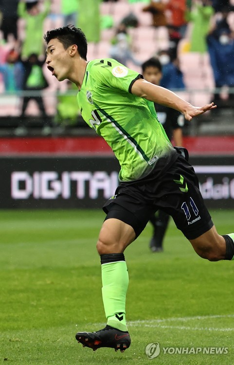 | ▲ Cho Gue-sung of Jeonbuk Hyundai Motors celebrates his goal against Daegu FC during a K League 1 match at Jeonju World Cup Stadium in Jeonju, 240 kilometers south of Seoul, on Nov. 1, 2020. (Yonhap) |
