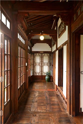 7채의 한옥 중 중심에 있는 학인당 본채는 이 고택 건축의 백미다. 한지가 아닌 수십장의 유리를 단 여닫이문이 커다란 건물 전면을 감싸고 있다.