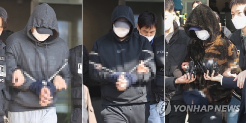 ▲ This combination of photos shows three suspects involved in the abduction and murder of a woman being taken to the Seoul Central District Court on April 3, 2023, for a hearing to review the police's request for their arrest warrants. (Yonhap)