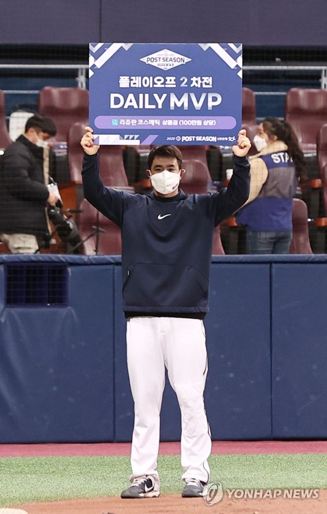 김재환은 플레이오프 2차전 데일리 MVP로 선정됐고, 100만원 상당 코스메틱 브랜드 리쥬란 상품을 품에 안았다.